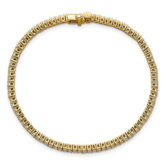 This 7-inch tennis bracelet is made from 14K yellow gold. It features 2 carats of lab-grown diamonds, prong set with 2 mm stones. The bracelet has a box clasp with a figure-eight safety catch.